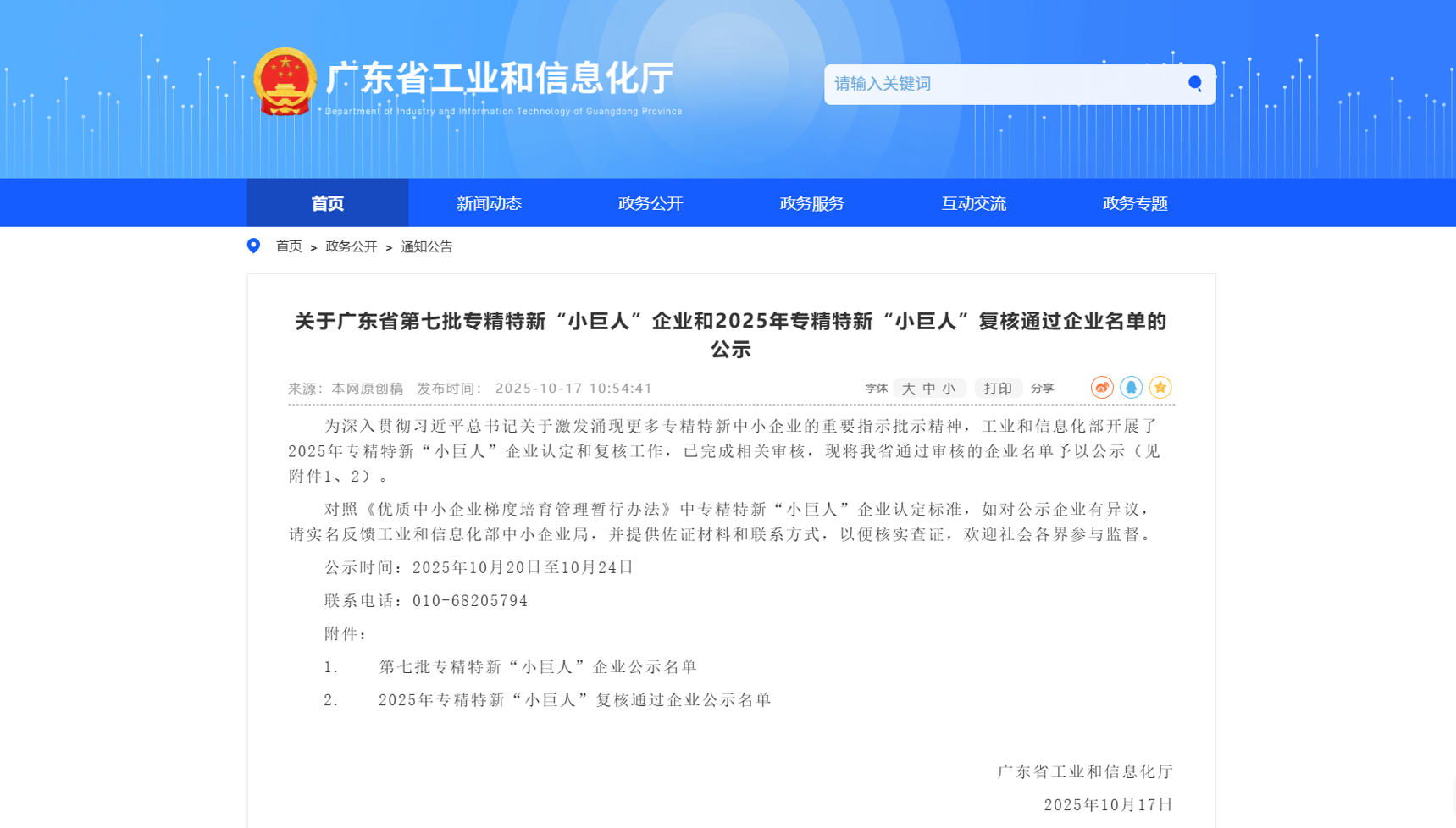 近日,廣東省工業和信息化廳公布了廣東省第七批專精特新“小巨人”企業和2025年專精特新“小巨人”復核通過企業名單(不含深圳),其中新認定企業344家,復核通過企業159家。